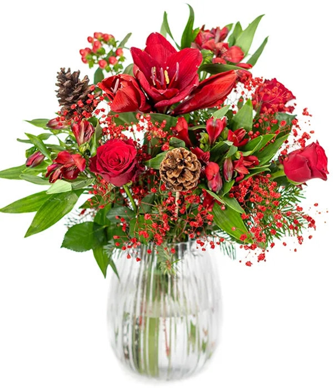 Bring the charm and warmth of Christmas into your loved one's home with our Festive Pines & Petals bouquet. Featuring radiant red roses, alstroemeria, hypericum, vibrant amaryllis, and touches of seasonal greenery. From £40.00 (Standard), £50.00 (Grand, as shown) and a larger Superior at £60.00 Plus standard local delivery of £5.95 (Vase not included but may be added)